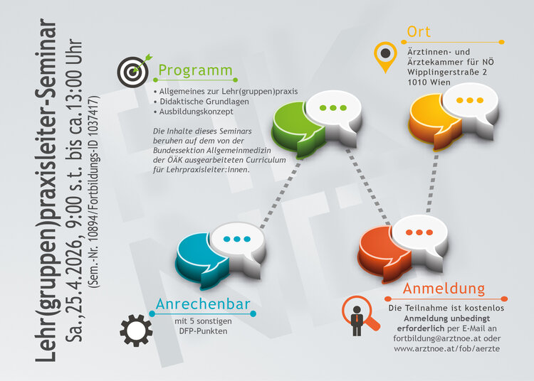- Absolvierung eines Lehr(gruppen)praxis-Leiterseminars im Ausmaß von zwölf Stunden (acht Stunden mittels E-Learning plus eine vierstündige Präsenzveranstaltung in der Ärztekammer)